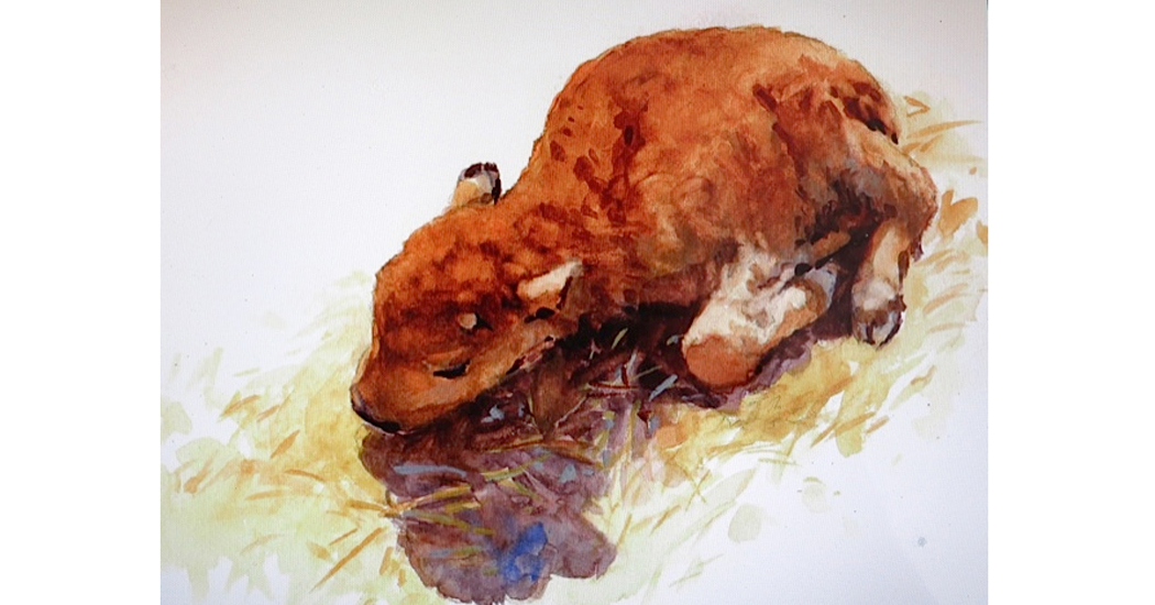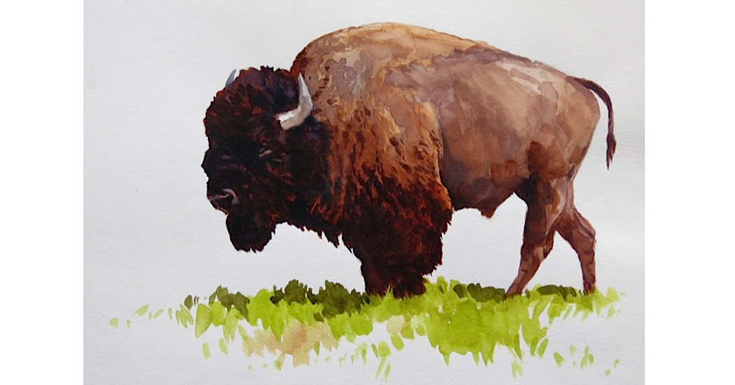 I loved drawing and painting Gordon but I had to learn something about a baby bison first. I soon discovered that baby bison are born sometime between April and June. A very young bison is reddish in color and is called a calf. It is easy to pick it out from the adult bison who have dark brown coat. The baby bison stays close to it’s mother for about one year and she protects and teaches it many things to help it survive. Later on, around September it’s coat begins to turn darker brown, it’s shoulder hump begins to appear and it’s horns begin to grow. It begins to eat grass and plants. The young bison continues to grow for three or four more years, until it becomes an adult.